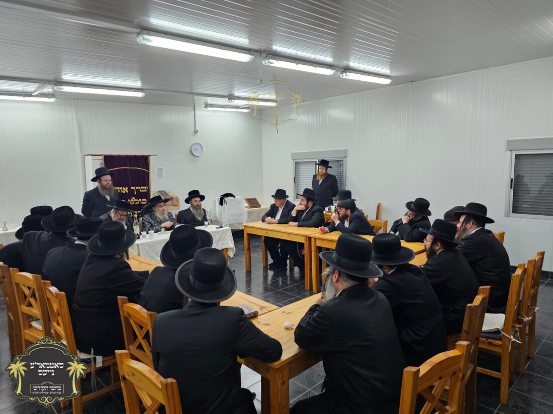 כ''ק רבינו הגה''ק שליט"א ביים מסיבת לחיים ודב''ק מיט די שוחטים אין אורעגוויי, נאך תפילת מעריב.