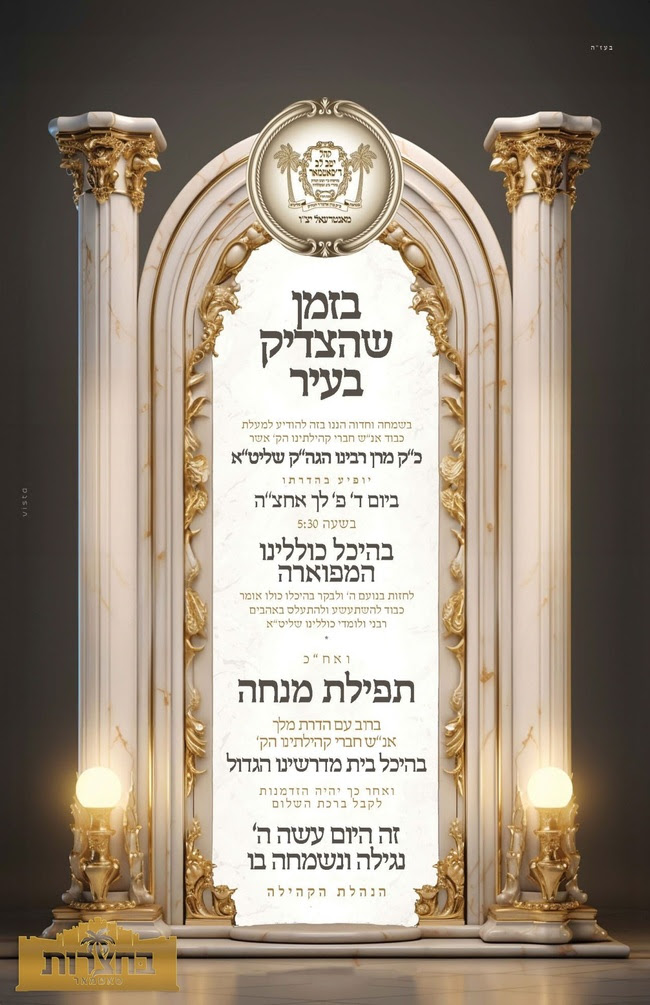 סאטמאר מהר”יי מאנטריאל: בשיר וקול תודה גרייטן זיך אנשי שלומינו, ווען צום ערשטן מאל וועט קהלתינו הקדושה אין מאנטריאל האבן די זכיה אפצורעכטן א שמחת שבע ברכות בחצרות קדשינו לרגל שמחת נישואי נכדת הוד כבוד קדושת מרן רבינו עט''ר שליט''א,