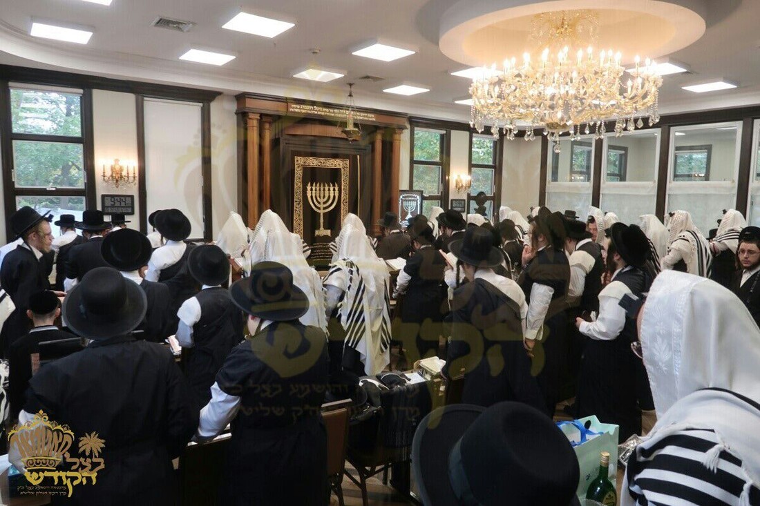 כ''ק רבינו הגה''ק שליט"א ביים זיך אומקוקן אויף די לימודים און ביי תפילת שחרית אינאיינעם מיט די עלטערע ילדי תשב''ר תלמידי מוסדותינו הק' אין מאנסי בבנין הת"ת החדש 'בנין משה חיים גאלדשטיין'.