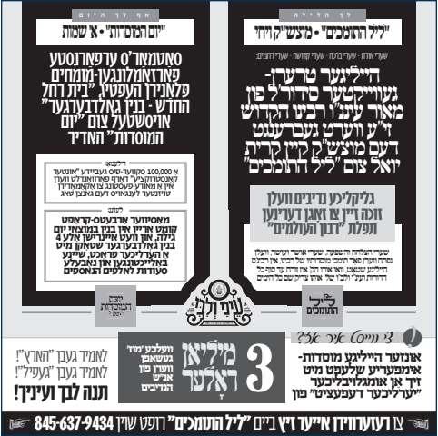 אַלעס וועט שטראָמען מיט האַרץ און געפיל, עיניהם ולבם כל הימים, צו פאַרשטאַרקן אומשאַצבאַרן כח המוסדות פאַר׳ן עתיד הדורות בדרך אבינו רועינו רבינו הקדוש זי״ע תחת דגלו של הוד כבוד קדושת מרן רבינו עט״ר שליט״א, ובנו הגאון הצדיק אב"ד ור"מ שליט"א, על בנינו ועל דורותינו!