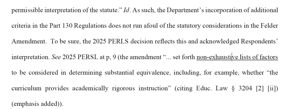 ערשטנס שרייבט די סטעיט זייער קלאר (די טענה וואס אבי שיק האט ליידער נאכגעגעבן אין געריכט) אז לויט זיי איז די גאנצע נייע געזעץ נאר נאך וועגן וויאזוי צו "אויפווייזן אז מען לערנט" אלע לימודים, און ברייטערט בלויז עטוואס אויס די פעטוועיס.